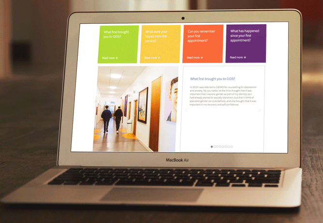 The Gender Identity Development Service, the fastest growing clinical service at the Tavistock and Portman NHS Foundation Trust, website design, photography and development.